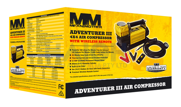 The Mean Mother Adventurer 4 Heavy Duty 12V Air Compressor has been designed for serious off road use. Packed with plenty of inflation power, it delivers an incredible 180 Litres per minute free air delivery. It's equipped with all the standard features you’d expect in a compressor of this quality such as thermal overload & circuit breaker protection, as well as a premium wireless remote control. The remote allows the user to start and stop the inflation process and get accurate tyre pressure readings without having to go back and forth to the compressor to continually turn it off and on. The 160PSI/ 1084kPa output will inflate an average 4x4 tyre (205/60R16) in around 2.3 minutes. The Adventurer III has been built on the same platform as our highly successful Adventurer II air compressor that was recently voted "Best Bang For Your Buck" by Unsealed 4x4 Magazine in their huge 12V Portable Air Compressor Comparison.
