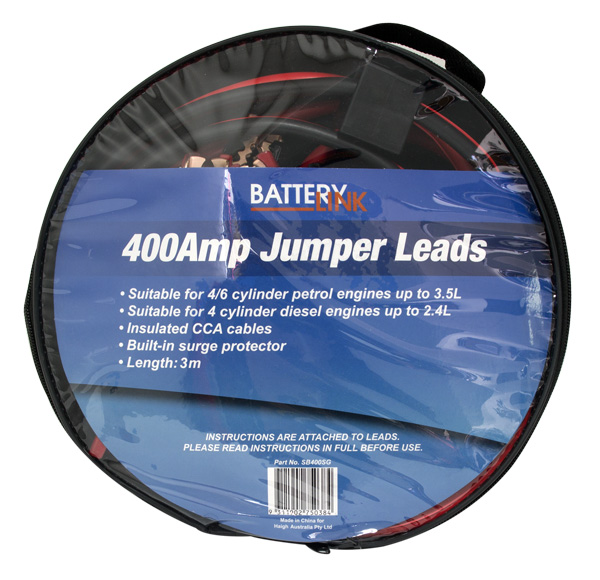 These jumper leads/booster cables are suitablefor most vehicles with a 4 or 6 cylinder petrol engine up to 4.5 litres and diesel engines up to 2.5 litres. PVC sheathed cable gives maximum power transfer. Fitted with fully insulated colour coded terminal clamps. Features built in surge protector to protect a vehicle's electronics and computer system from power spikes during jump starts.