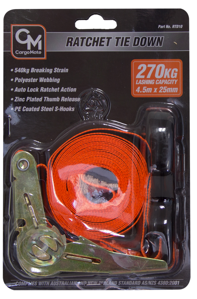 Automatic locking ratchet action with thumb release. Strap made from polypropylene webbing.