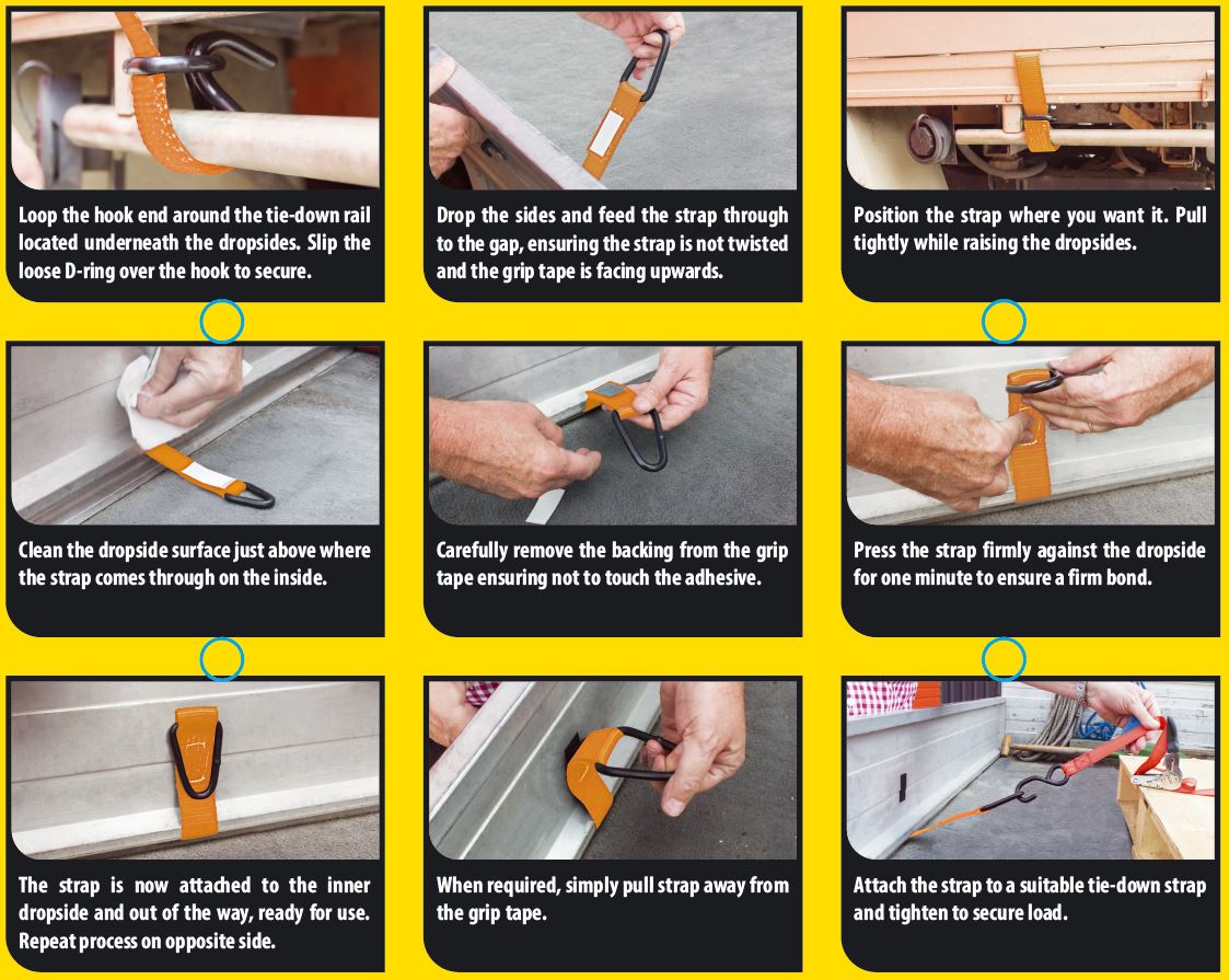 The perfect solution for securing low level loads in the back of utilities and trucks fitted with aluminium or steel dropsides. They limit the need to install permanent anchor points and eliminate the possibility of dropsides bending when tensioning straps. They simply slip between the floor & dropside and can be moved forward or backward as required. Multiple straps can be used to cater to different load configurations.