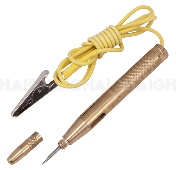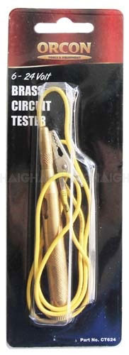 Heavy duty brass tester for identifying short circuits, broken wires and faulty connections in all DC 6V to 24V electrical systems. Includes aligator ground clip and metal tester probe.