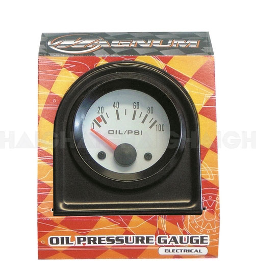 Quality electric 50mm oil pressure gauge, featuring a backlit dial with modern white face. Complete with hardware for in or under dash fitment.