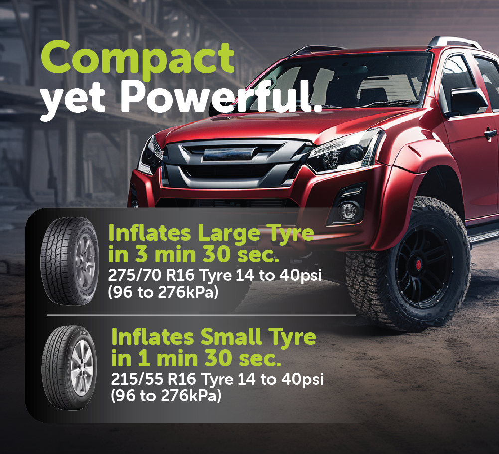 - Inflates 275/70 R16 Tyre 14 to 40psi (96 to 276kPa) in 3 min 30 sec