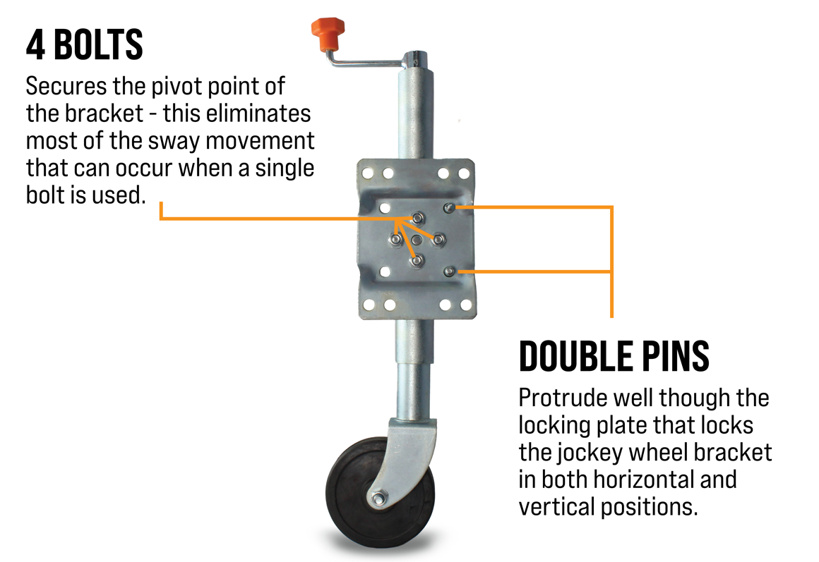 - A Combination of 4 Bolts Securing the Pivot Point, and the Locking Point Mechanism provides Great Stability - Not all Jockey Wheels offer this Feature