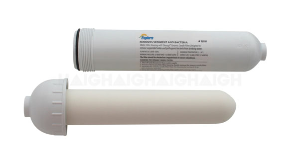 Water filter housing with replaceable Sterasyl® ceramic candle filter, designed to remove suspended solids and pathogenic bacteria from drinking water.