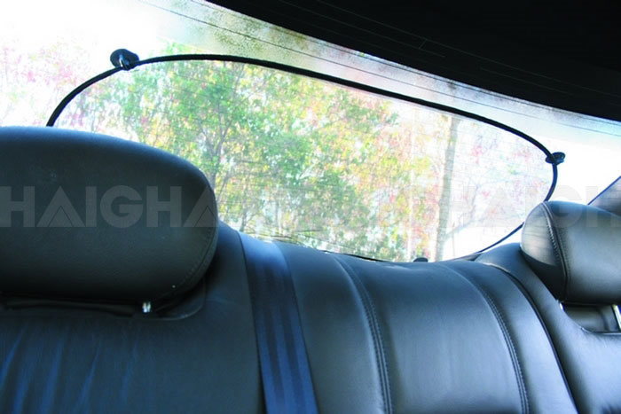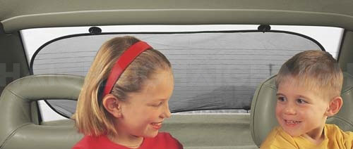 Universal rear sunshade blocks out harmful UV rays and keeps the hot sun off children, animals or groceries.